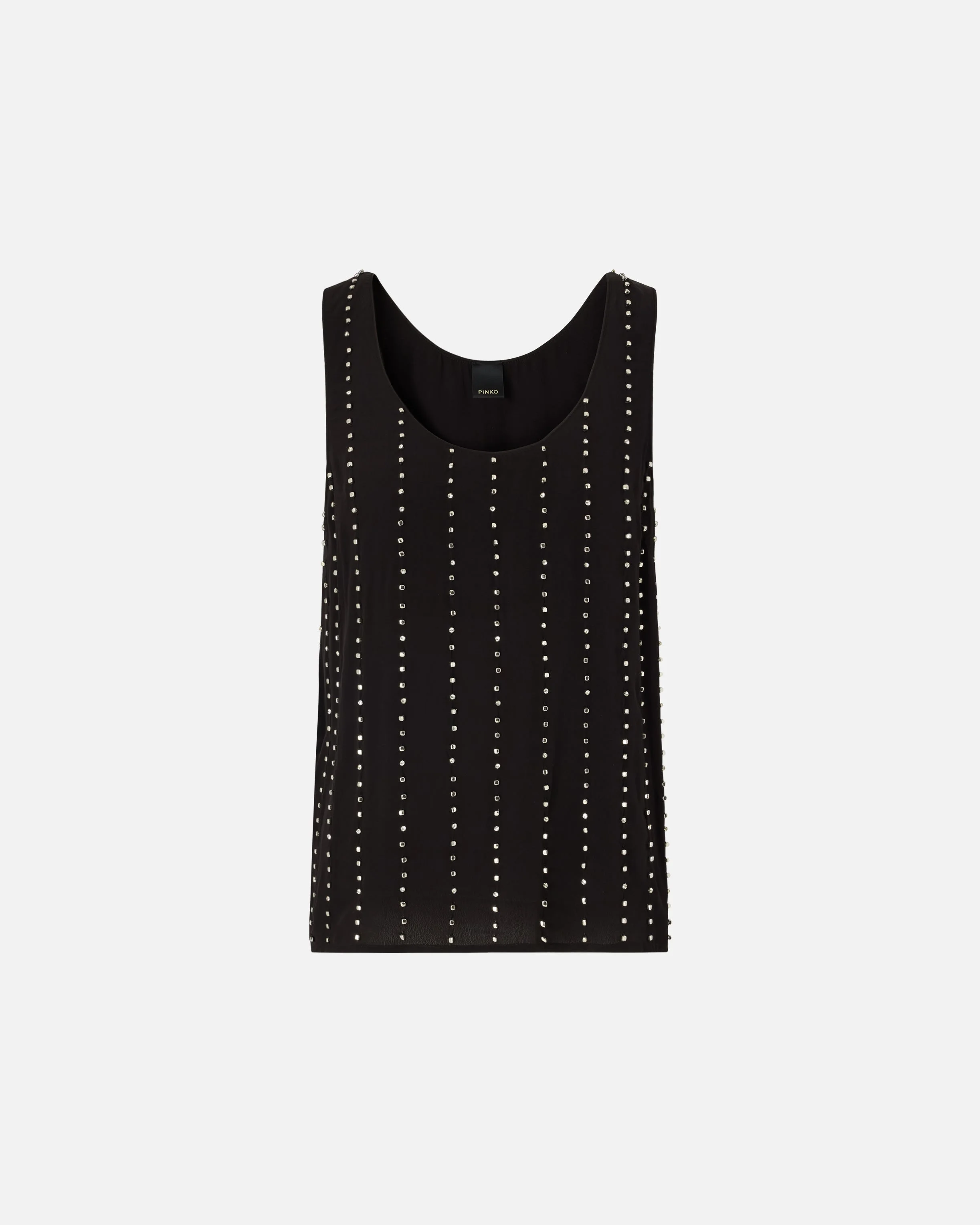 106214A31F-Z99 Vest top with a wide round neck, made of viscose crepe fabric with a fluid and flowing feel. Thanks to the striking, pinstripe-inspired motif formed by alternating small cube-shaped metallic elements and hand-embroidered set crystals, this piece is a real gem—literally. Thanks to its versatile yet elegant design, it's perfect to wear under a jacket and with tailored trousers, or with a pair of special jeans. COMPOSITION Outside Fabric: VISCOSE 100% - Lining: VISCOSE 100% - : Glass 100% - : Brass 100% brass 100% - : POLYESTER 100% MEASURES W: 0.2 g