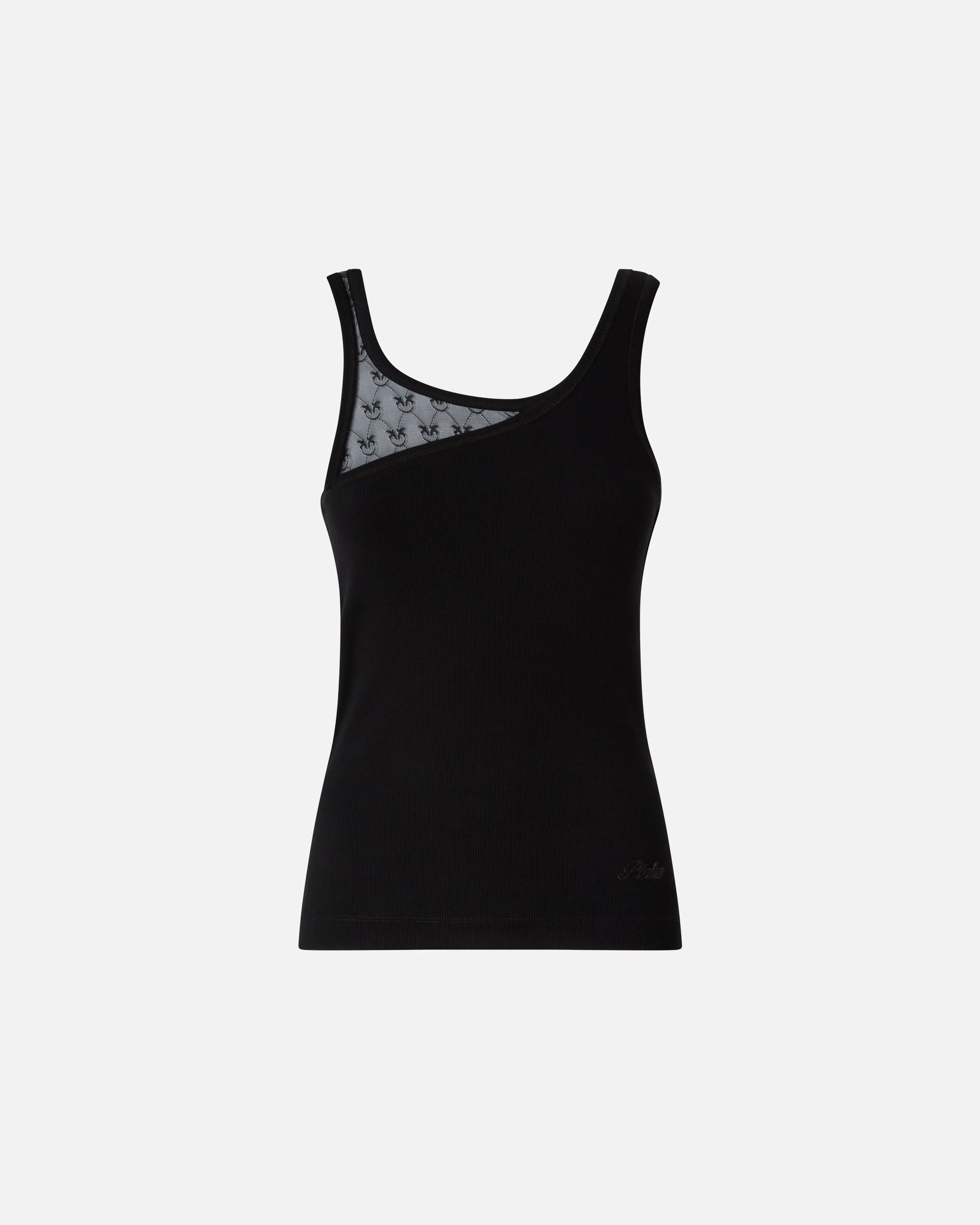 106461A362-Z99 Round-neck top in soft, ribbed stretch cotton fabric, featuring a sheer lace insert with the Love Birds logo all over. Wear this garment with your favourite jeans for a modern look that won't sacrifice femininity. COMPOSITION 1° Outside Fabric: COTTON 97% ELASTANE 3% - 2° Outside Fabric: POLYAMIDE 92% POLYAMMIDE 92% ELASTANE 8% MEASURES W: 0.15 g