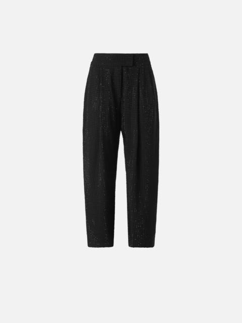 PATRE TROUSERS − 103549A287Z99 Elegant women's pants in yarn-dyed fabric characterized by the application of small rhinestones all over the garment, giving special sparkles with every movement. The wide-leg pants are slightly rounded at the hips, for a wide and comfortable fit, and are built with a high waistband with pleats, French pockets on the hips and welt pockets on the back. The hidden zip closure is completed by a double hook-and-eye closure at the waist. Pair the pants with the open-back waistcoat for a total look entirely covered in rhinestones, feminine and elegant to show off for special occasions, ceremonies and events where you will be the protagonist for your style. COMPOSITION Outside Fabric: POLYESTER 92% VISCOSE 6% ELASTANE 2% - Lining: POLYESTER 55% VISCOSE 45% - : Glass 100%