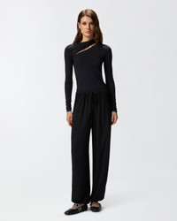 PANZEROTTO TROUSERS − 105674A2QWZ99 Trousers with a very wide leg and slightly contrasting front inserts just below the waist. The very fine, fluid and light technical crepe fabric is particularly suitable for everyday wear. Complete with an elasticated drawstring waist, these wide-leg trousers are very comfortable. COMPOSITION Outside Fabric: POLYESTER 100% - Accessory Yarn: ACRYLIC 50% WOOL 50%