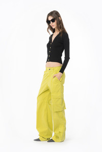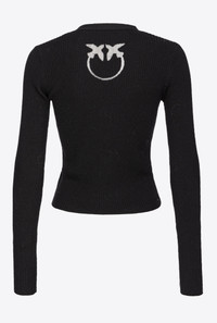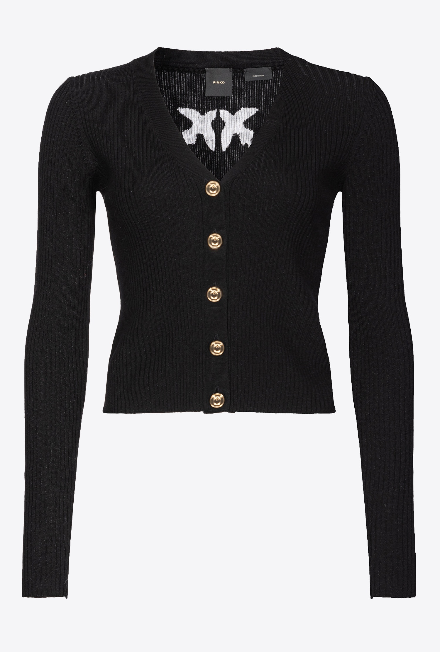Short cardigan in ribbed knit 100% wool fabric with bright inlaid Love Birds logo in the middle at the back. Slim-fitting piece with V-neck and long sleeves. Golden metal button fastening on the front. COMPOSITION 1° Outside Fabric: WOOL 100% - 2° Outside Fabric: POLYAMMIDE 52% POLYAMIDE 52% POLYESTER 48%