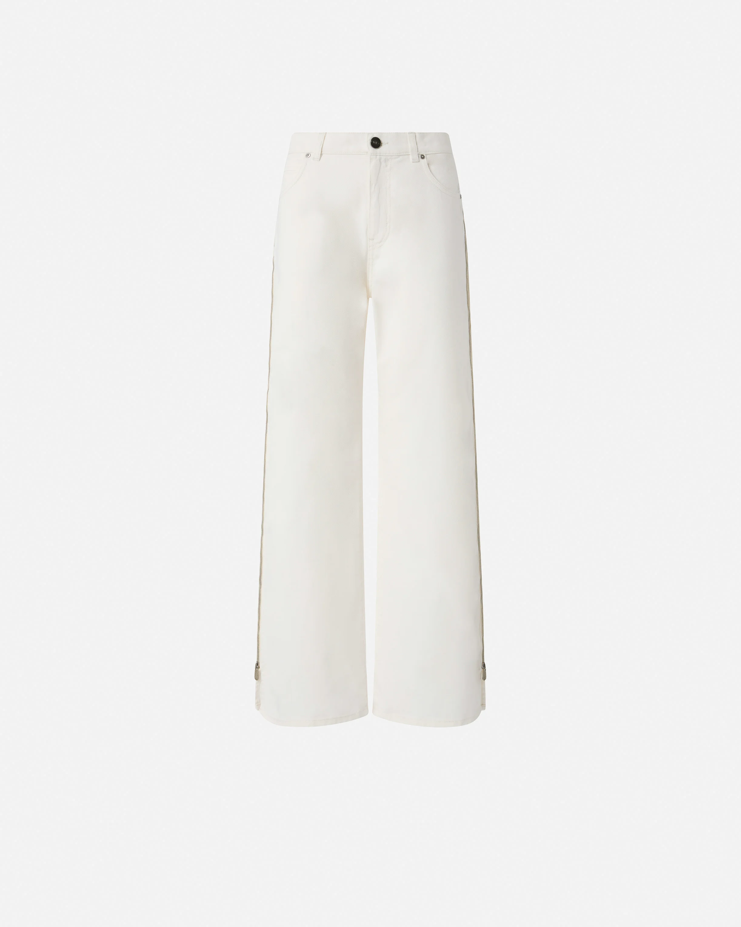 WANDA WIDE LEG ZIP − 104928A2V2Z05 Women's white cotton bull denim jeans with a straight-cut, wide leg sporting a vertical full-length metal zip down the side. The zip allows you to wear these low-waisted trousers both completely closed and open, leaving a glimpse of the satin high-waisted panties with lace trim that look like a pair of lingerie-inspired shorts. The Love Birds logo is heat-stamped on the back of the waistband. These jeans allow you to adapt your style in a bold way with just one action, whenever you like. Low waist with belt loops, and metal tack-button and zip fastening. This model is a little wider than the usual size. COMPOSITION 1° Outside Fabric: COTTON 100% - 2° Outside Fabric: ACETATE 76% SILK 24% - Lining: COTTON 100% - : POLYAMIDE 61% POLYAMMIDE 61% VISCOSE 39%