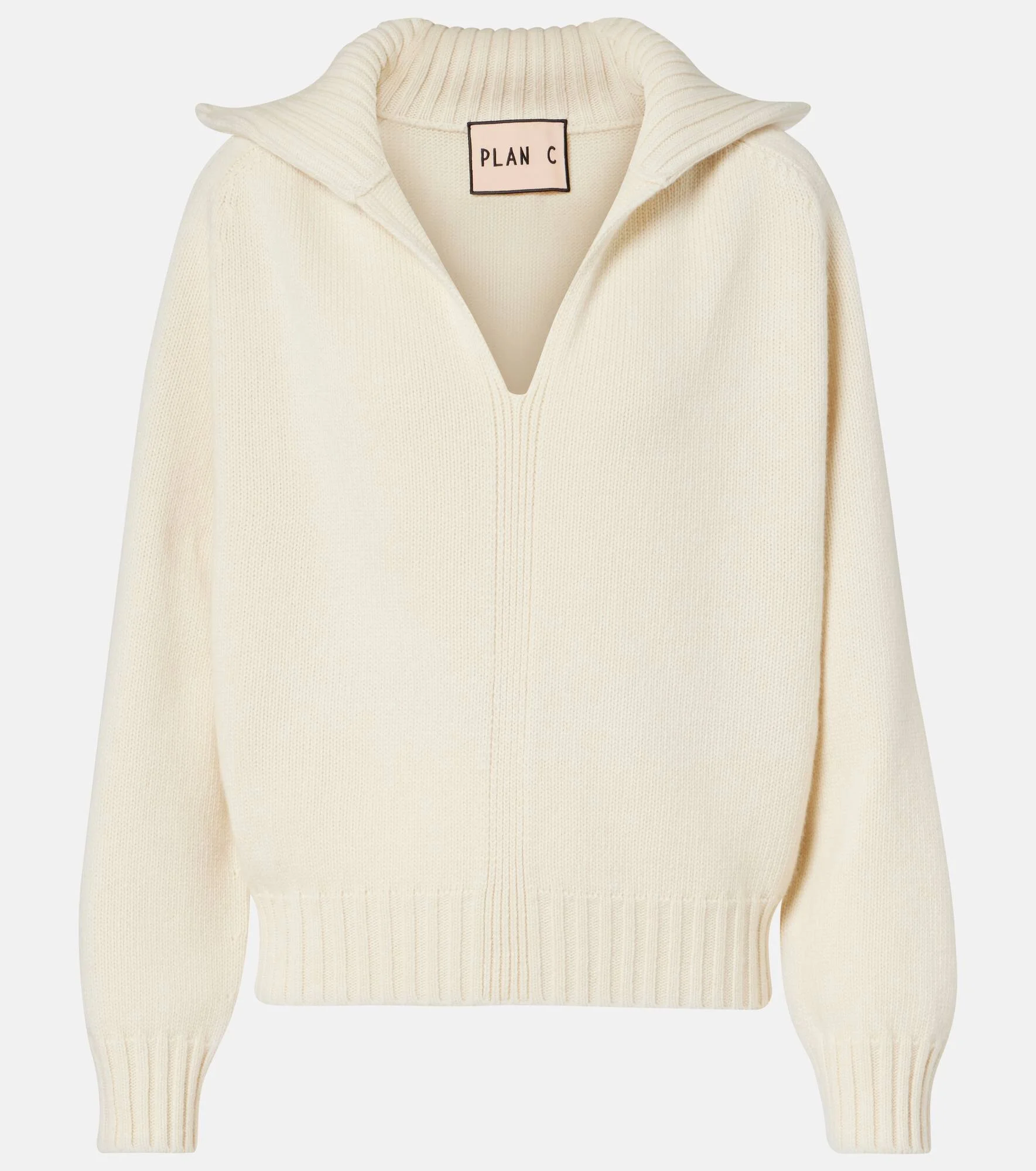 Crafted in Italy from wool and cashmere, this sweater from Plan C features a sailor collar and a ribbed hem and cuffs. The design is finished with a V-neckline. Product Details - Material: 70% wool, 30% cashmere - Care instructions: dry clean - Made in Italy - Designer color name: Butter - Item color: beige - Collar: V-neck - Cuff: ribbed - Hem: ribbed - Item number: P01088250 Size & Fit - True to size - Designed for a loose fit - Stretchy fabric - Falls to the hip - The model seen in the picture is 178cm-5'10" and wearing a size IT 40