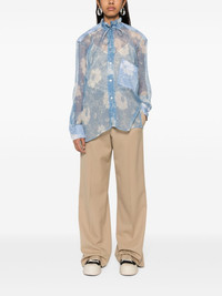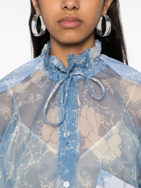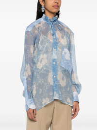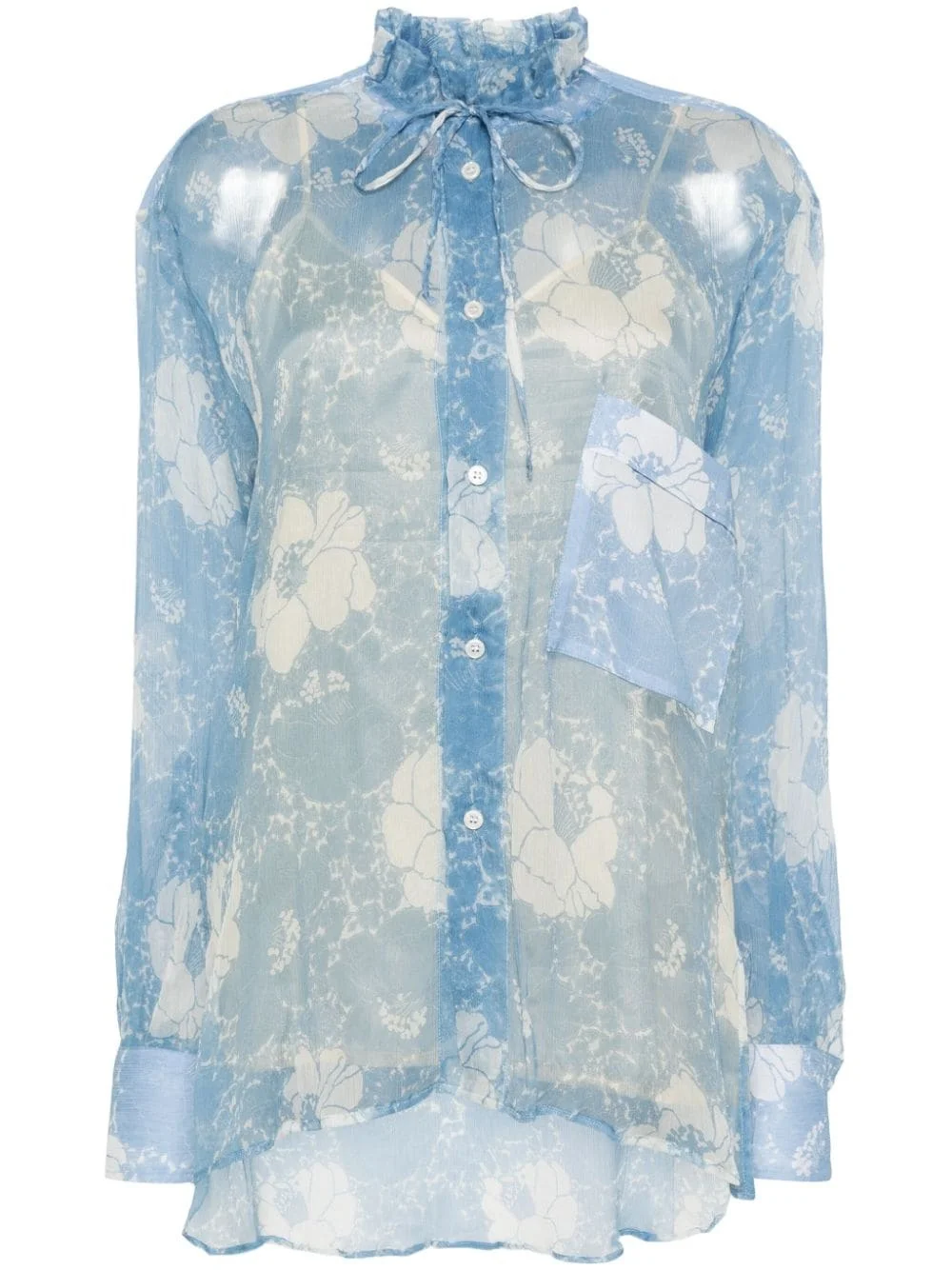floral silk shirt Highlights - Sky blue, white - Silk - Lightweight - Semi-sheer construction - All-over floral print - Ruffle collar - Chest patch pocket - Long sleeves with buttoned cuffs - Side slits - Internal slip top - High-low hem - Front button fastening Made in Italy Composition Lining: Cupro 100% Outer: Silk 100% SIZE & FIT Model measurements Height 5 ft 9 in(1.76 m) Bust/Chest 31.88 in(81 cm) Hips 35.43 in(90 cm) Waist 22.44 in(57 cm) FittingInformation Designed to be unstructured, offering a loose fit throughout The detachable slip sits just away from the body, offering a close yet comfortable fit Made from a lightweight non-stretch fabric This piece fits true to size – take your usual size Washing instructions Dry Clean Only