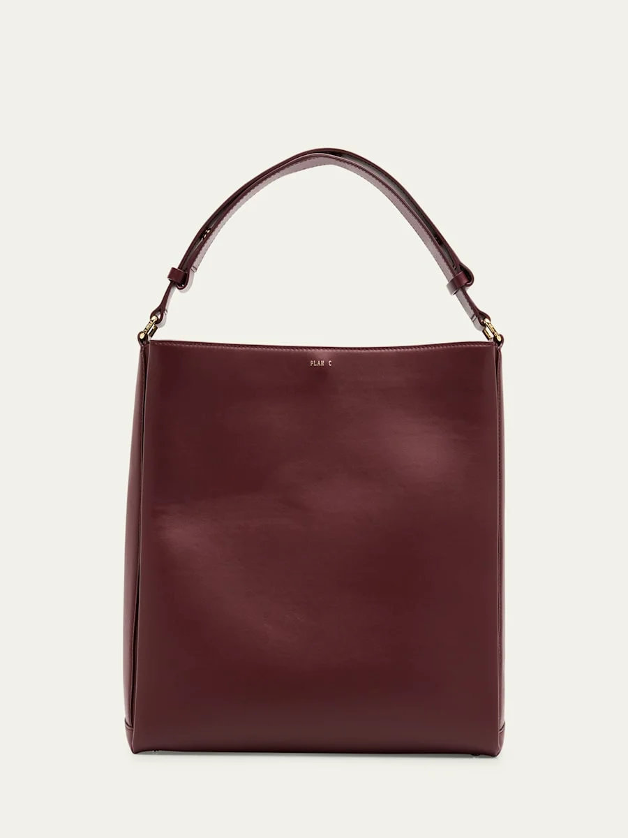 Plan C tote bag in vitello leather detailed with tiny foiled logo lettering Adjustable shoulder strap Open top with magnetic closure Interior, one zip pocket Lining: Nylon/cotton Feet protect bottom of bag Approx. 13.4"H x 11.8"W x 4.33"D Made in Italy Online Inquiries: BGS21_V6LBV| Store Inquiries: #5040832