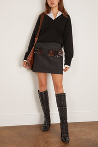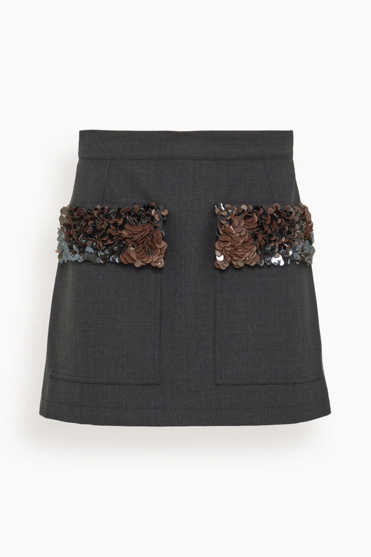 The Plan C Skirt in Anthracite Melange is a twist on a classic. This mini skirt features a suiting inspired silhouette with playful sequins across the pockets. Wear yours with a sweater and boots. FIT DESCRIPTION MODEL MEASUREMENTS - Fits true to size, take your normal size - Mini skirt - Tailored silhouette - Midi rise - Patch pockets - Sequin detail - 97% wool, 3% elastane - Rayna is wearing a size 38/ 2 US - Bust: 34” - Waist: 24” - Hips: 32” - Height: 5’8.5”