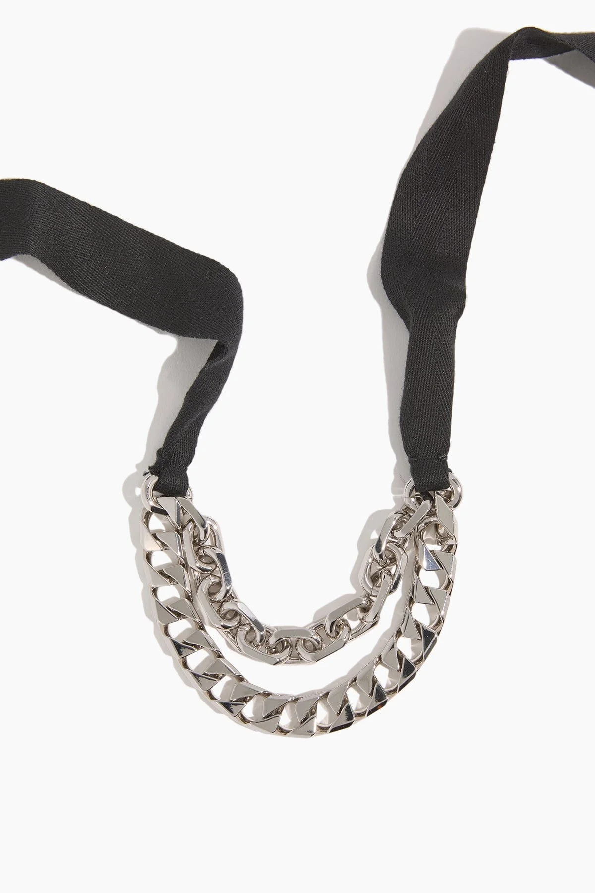 The Plan C Double Chain Necklace with Rib in Nikel Lucido will be a statement making necklace. You'll love the double strands of this chain necklace with a ribbon tie closure. FIT DETAILS - Necklace - Double metal chains - Adjustable ribbon - 80% metal, 18% cotton, 2% leather