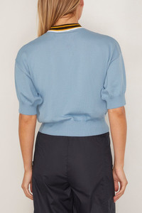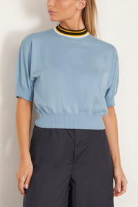 The Plan C Short Sleeve Knit Top in Sky Blue is a great every day essential to add to your wardrobe. This short sleeve sweater features a contrasting striped neckline in lightweight cotton. Wear yours with a skirt and sandals. - Short sleeve sweater - Relaxed fit - Contrasting neckline - Ribbed trim - 100% Cotton