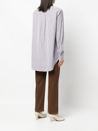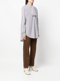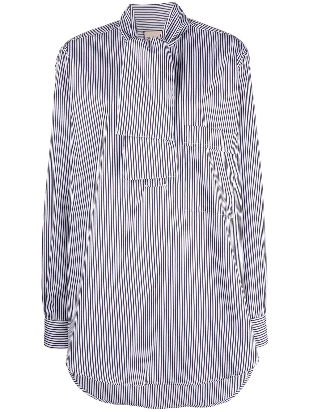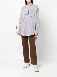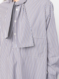 striped poplin shirt blue cotton poplin texture stripe print gathered tie neck front button fastening long sleeves curved hem Made In Italy Composition Cotton 100% SIZE & FIT Model measurements Height 5 ft 11 in(1.8 m) Bust/Chest 33.07 in(84 cm) Hips 37.4 in(95 cm) Waist 25.19 in(64 cm) FittingInformation This piece fits true to size. We recommend you get your regular size Cut for a loose fit Made with a mid-weight non-stretch fabric Washing instructions Machine Wash