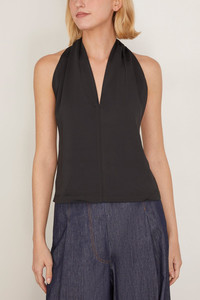 The Plan C Tank Top in Black makes a statement in the back. This tank top has a deep v-neckline with a strappy tie back closure. Wear yours with trousers and flats. - Tank top - V-neckline - Tie back straps - Viscose/elastane