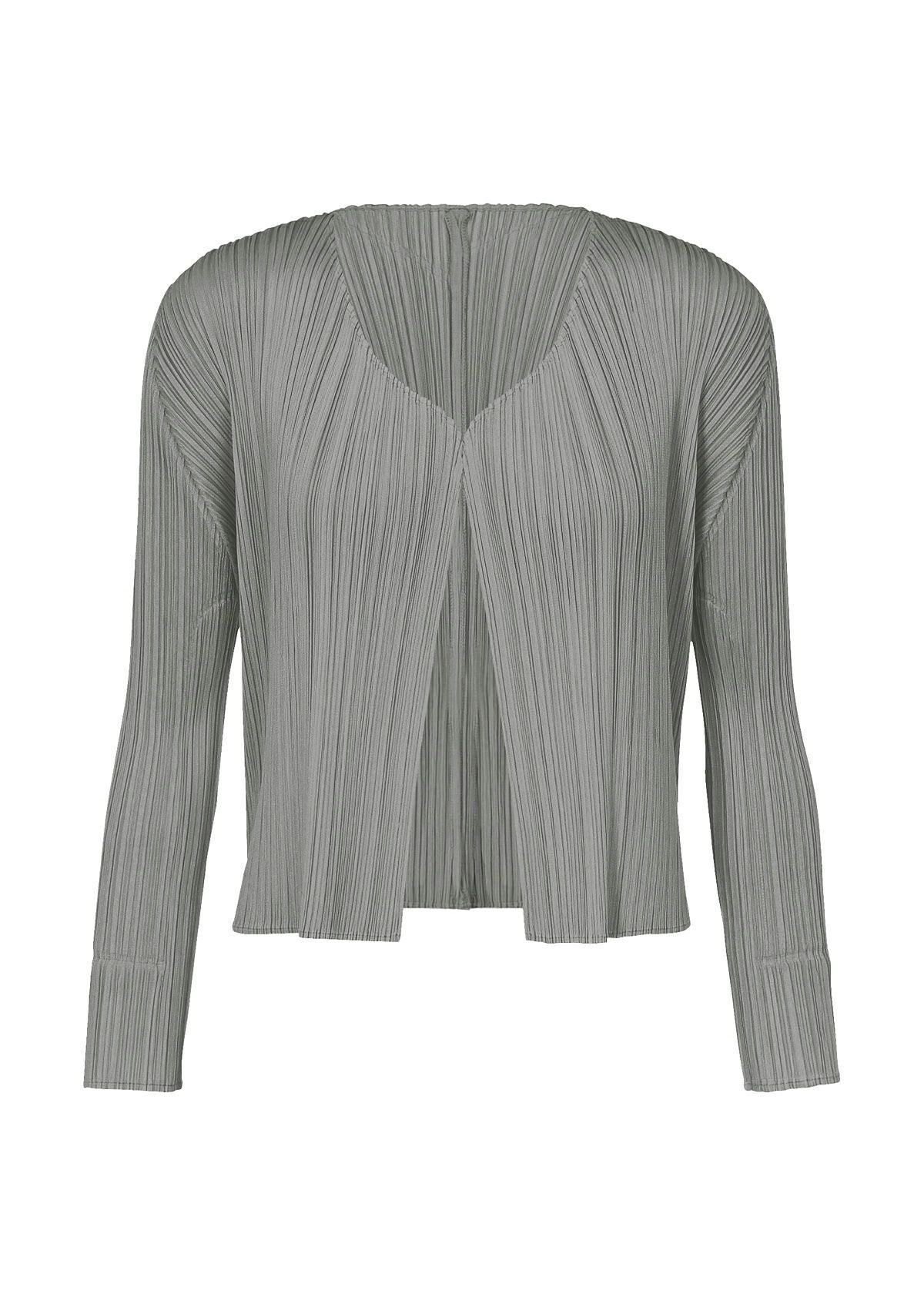 A standard product that is available seasonally with randomly pleated patterns. This is a short length cardigan.