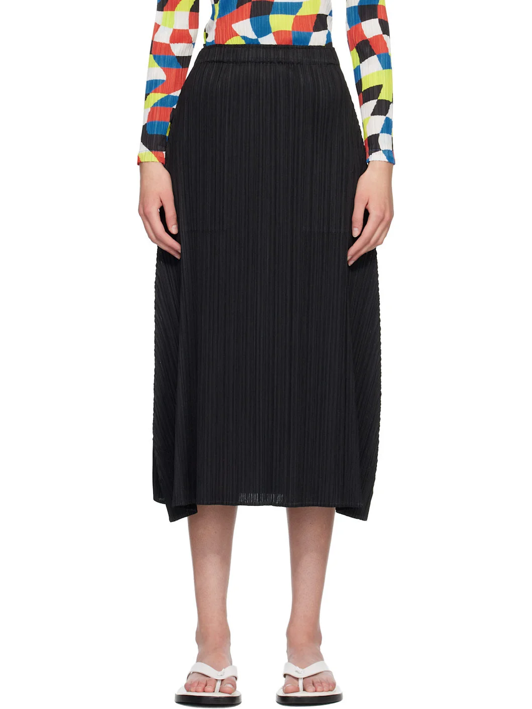 Garment-pleated tricot maxi skirt. · Elasticized waistband · Two-pocket styling Supplier color: Black 100% polyester. Made in Japan 261941F093014