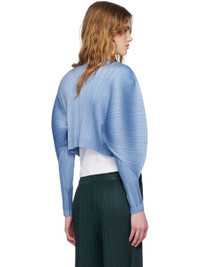 Garment-pleated tricot cardigan. · Y-neck · Single-button closure · Cropped hem · Dolman sleeves Supplier color: Steel Blue 100% polyester. Made in Japan 261941F095001