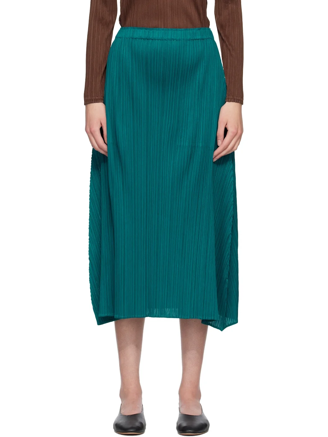 Garment-pleated tricot maxi skirt. · Elasticized waistband · Two-pocket styling Supplier color: Turquoise Green 100% polyester. Made in Japan 261941F093012