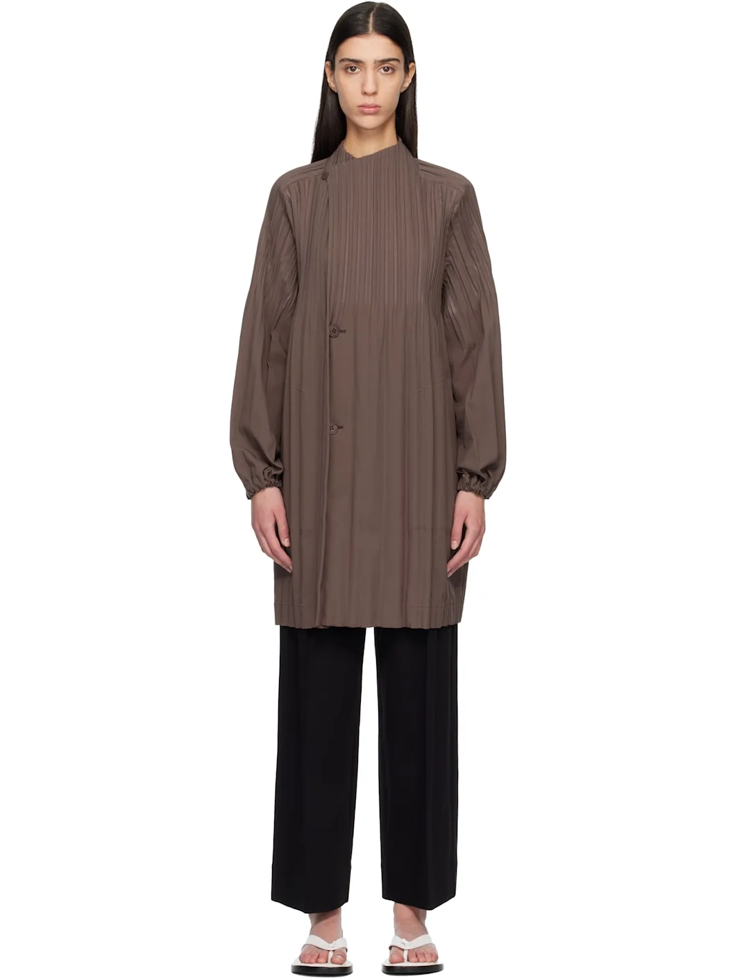 Windproof taffeta coat. · Pleats at mock neck, front, shoulders, and back · Offset button closure · Welt pockets at waist · Balloon sleeves · Elasticized cuffs · Unlined Supplier color: Brown 100% polyester. Made in Japan 252941F059002
