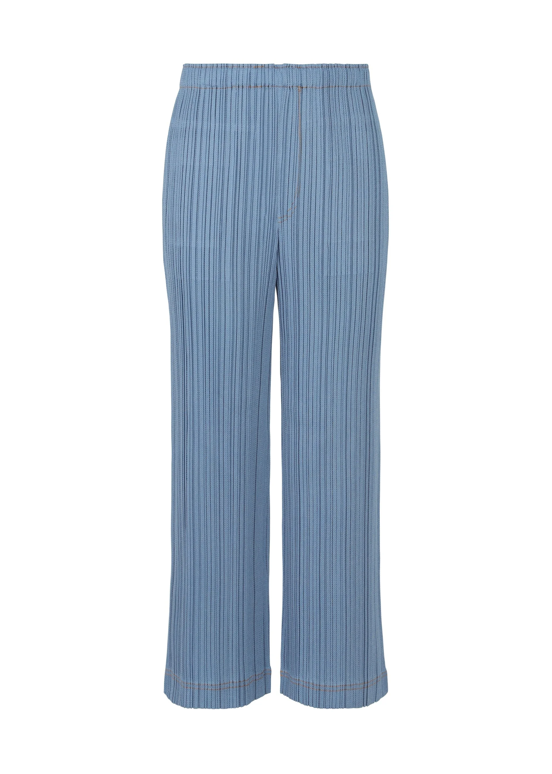 Straight pants made from a textile that incorporates cotton, with a moderate sheen and a denim-like feel. Stitching is done in an accent color that matches the fabric. There are pockets on both the front and back sides. Product Information Material: 76% polyester, 24% cotton Country of origin: Japan Waist specifications:rubber Pocket (position):Both front and rear sides