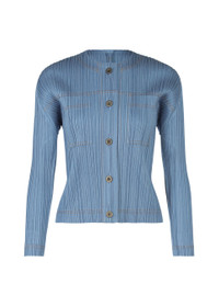A blouson made of textile that incorporates cotton, with a moderate luster and a denim-like feel. Stitching is done in an accent color that matches the fabric. There are button pockets on the left and right chest. Product Information Material: 76% polyester, 24% cotton Country of origin: Japan neckline/collar:No collar/round neck Front opening:button Pocket (position):both breasts