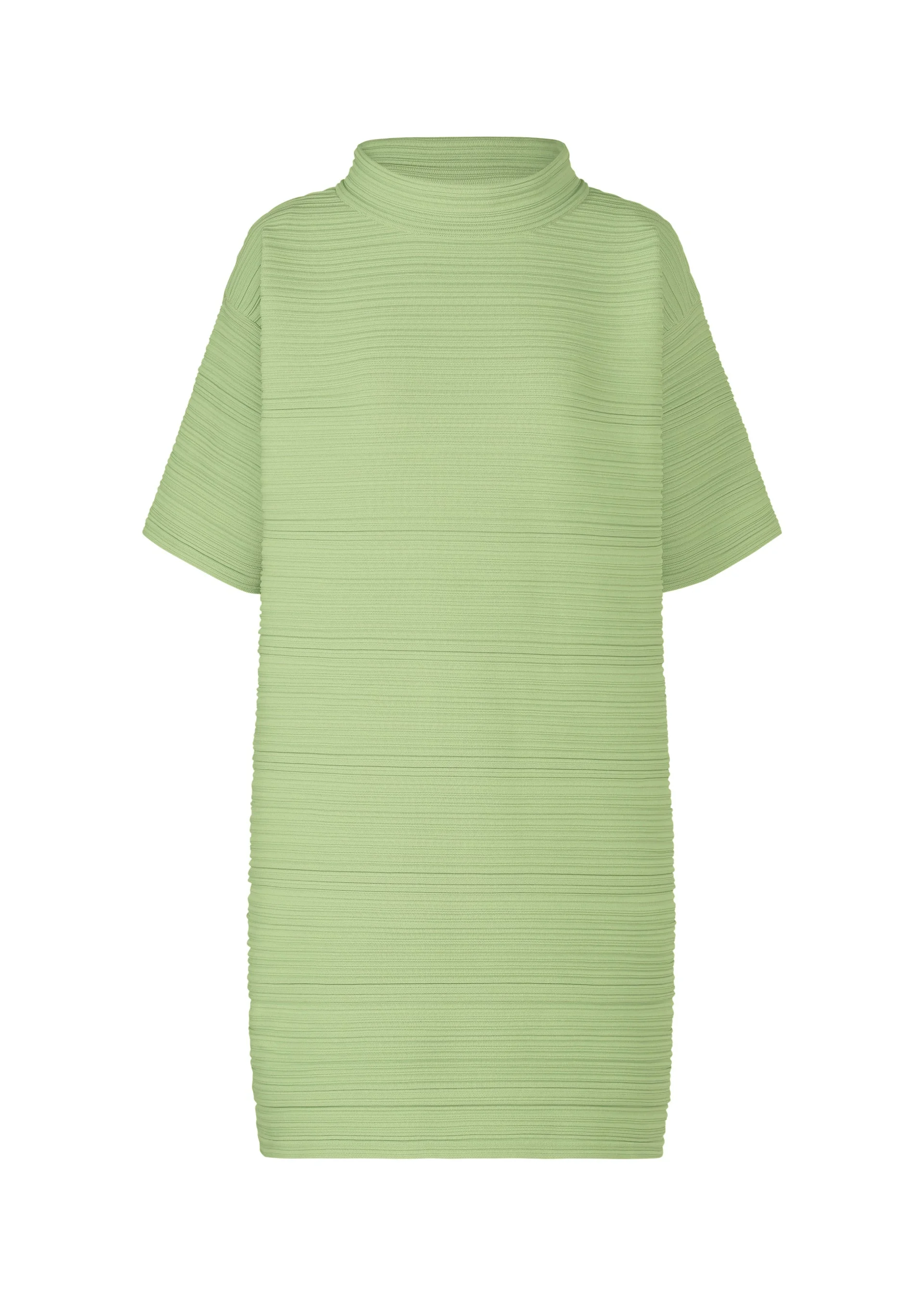 Mock neck half-sleeve tunic with pleats and horizontal knitting. Made from 100% recycled polyester, it is lightweight and machine washable for easy care. Product Information Material: 100% polyester Country of origin: Japan neckline/collar:mock neck