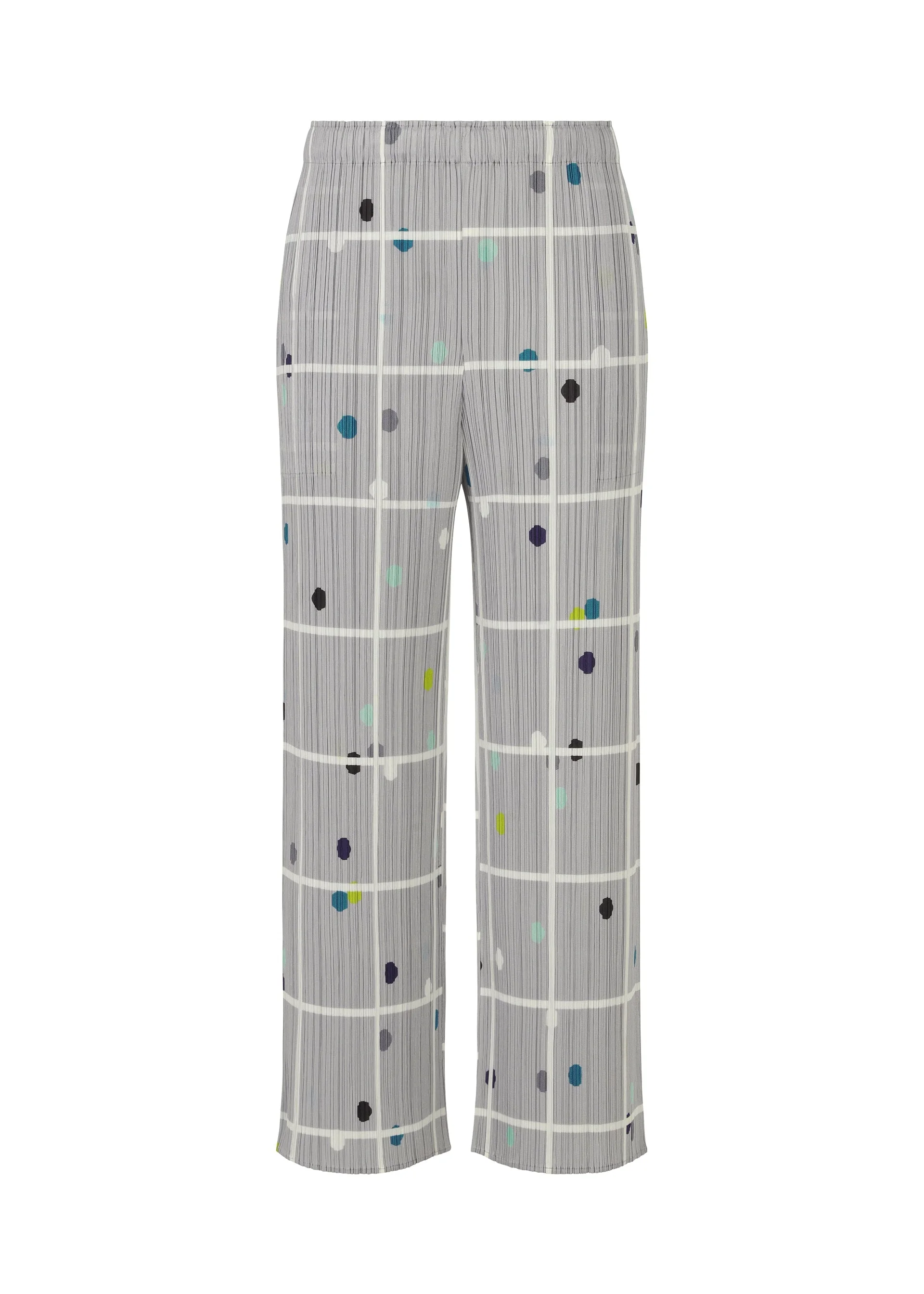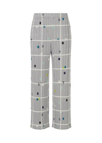 These straight pants feature a print inspired by scenery where people and cars are reflected in a building’s windows as they pass by in a city. The mix of plaid and dots expresses intersecting lines. There are pockets on both sides. Product Information Material: 100% Polyester Made In Japan Waist specifications:Rubber Pocket (position):Both sides