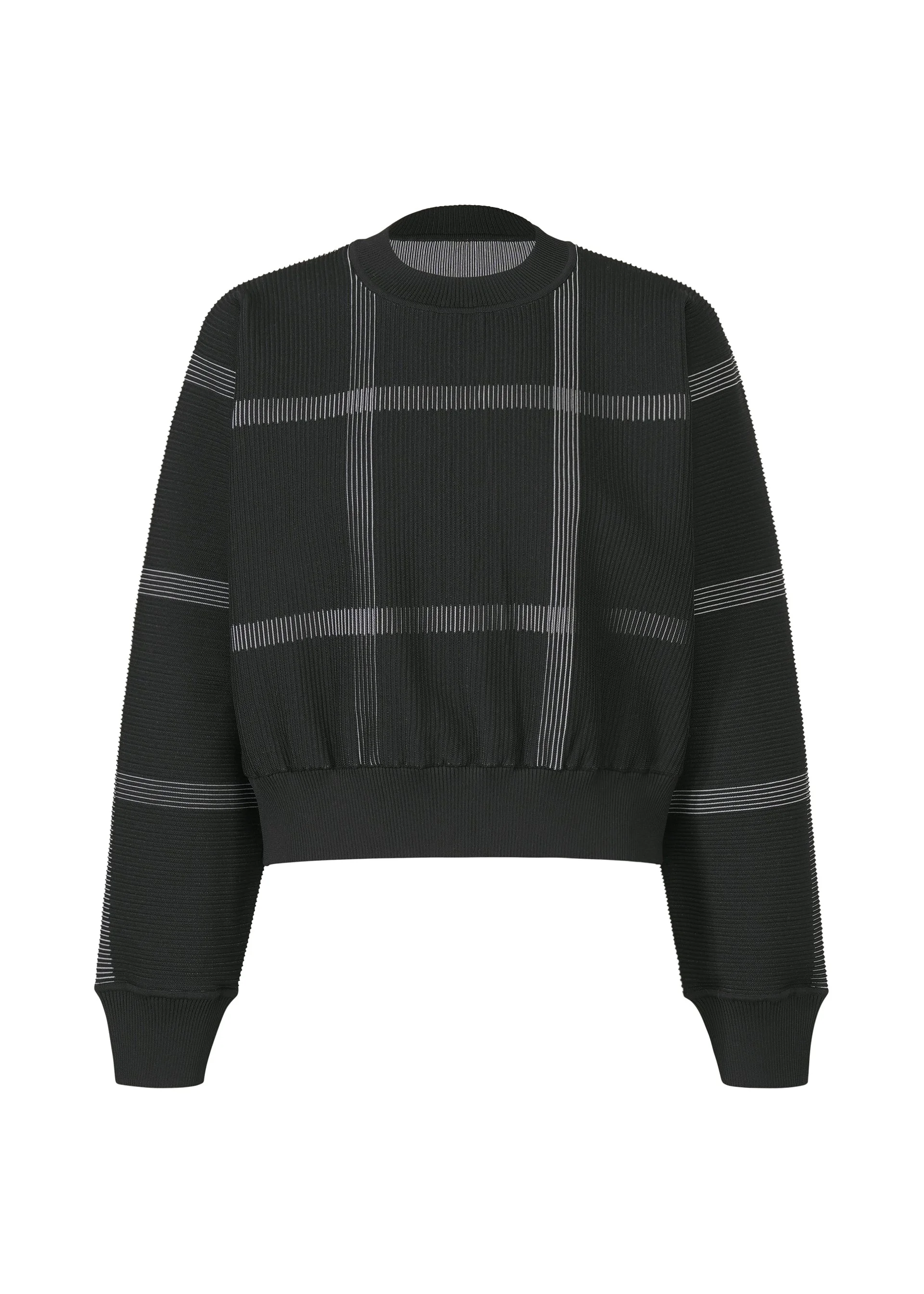 This round-neck, long-sleeved knit features a plaid pattern inspired by scenery where people and cars are reflected in a building’s windows as they pass by in a city, expressed with a knit fabric. The design is characterized by the pattern that appears and disappears depending on the viewing angle. Product Information Material: 99% Polyester, 1% Nylon Made In Japan Neckline / collar:Crew neck Others:Rib (hem)