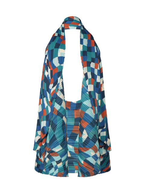This long vest features a print that evokes neatly arranged squares spinning as if they were dancing. It is characterized by the draping that appears around the neck when worn, although it forms an oval when laid flat. Product Information Material: 100% polyester Made in Japan