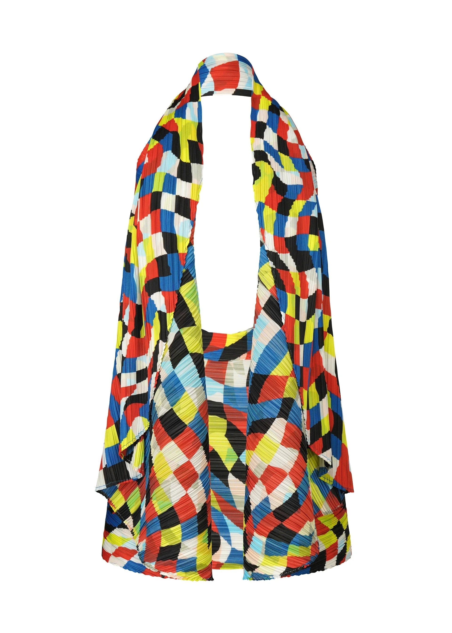 This long vest features a print that evokes neatly arranged squares spinning as if they were dancing. It is characterized by the draping that appears around the neck when worn, although it forms an oval when laid flat. Product Information Material: 100% polyester Made in Japan