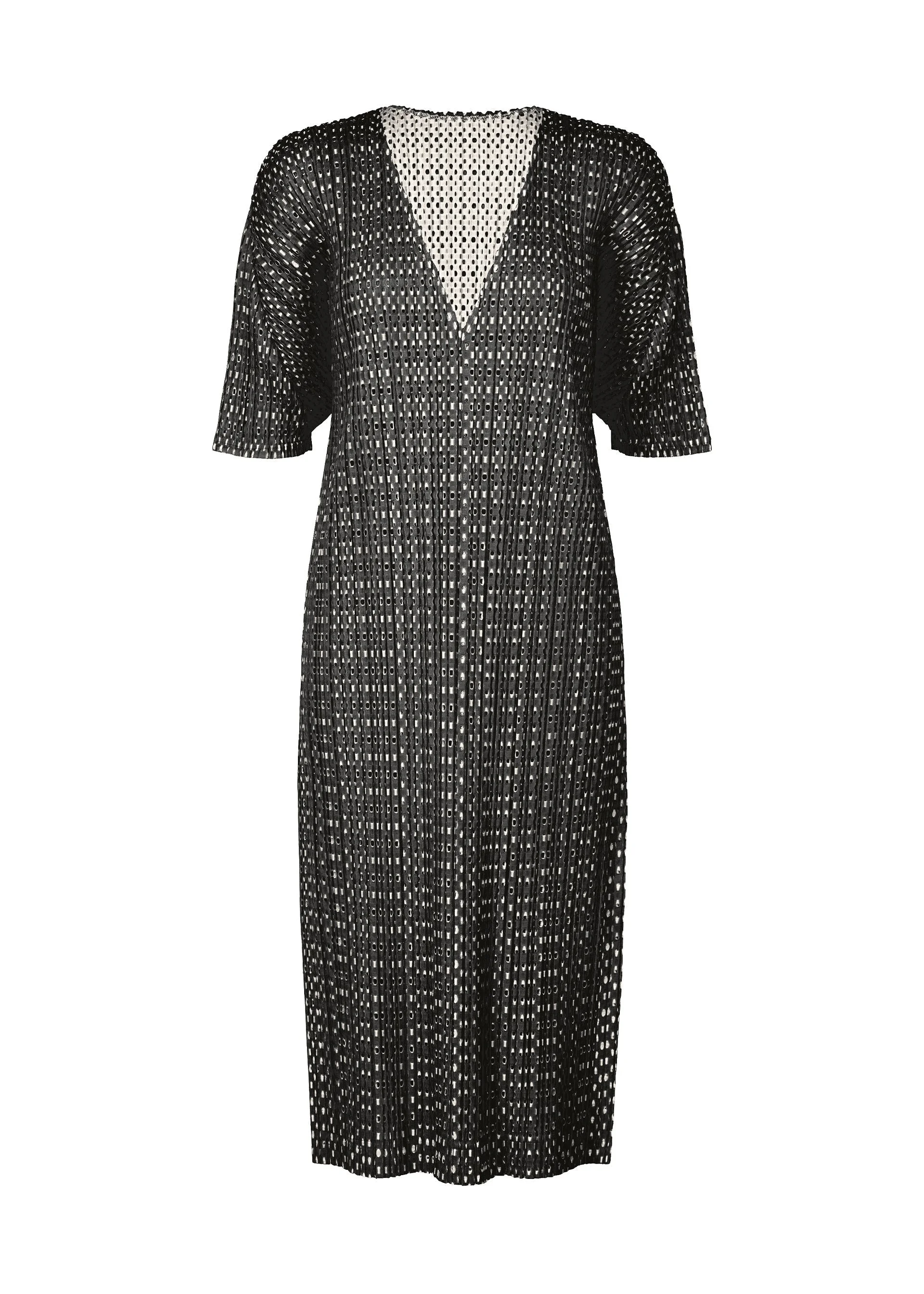 This V-neck, short-sleeved tunic is made from a refreshing mesh fabric that is perfect for early summer. The front and back mesh layers are knitted in a slightly shifted manner to make it look like the back colors are flickering. It has slits on both sides. Product Information Material: 100% polyester Made in Japan Neckline / Collar:V-neck Slit (position):Both sides