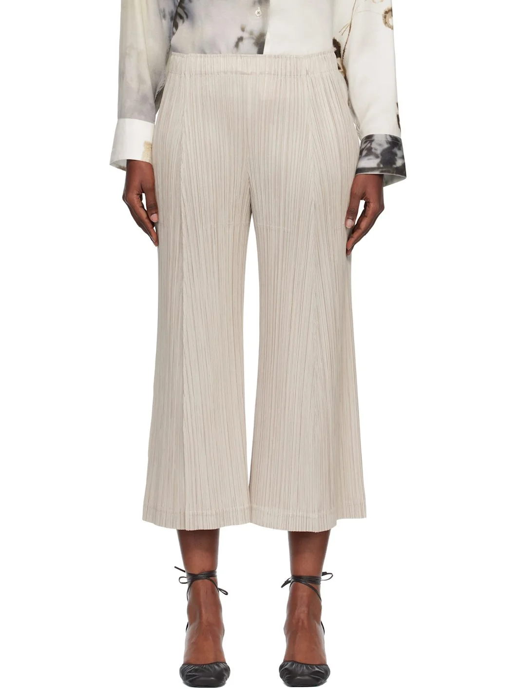 Garment-pleated tricot trousers. · Flared leg · Elasticized waistband · Two-pocket styling Supplier color: Greige 100% polyester. Made in Japan 252941F087042
