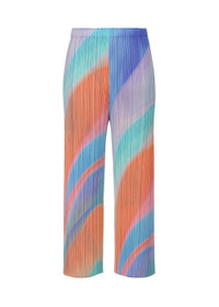 These wide pants feature a colorful gradation print inspired by groovy rhythmic waves. It is recommended to style them with solid-colored pleated items. They have pockets and slits on both sides. Product Information Material: 100% polyester Made in Japan Waist specifications:rubber Pocket (position):Both sides Slit (position):Both sides