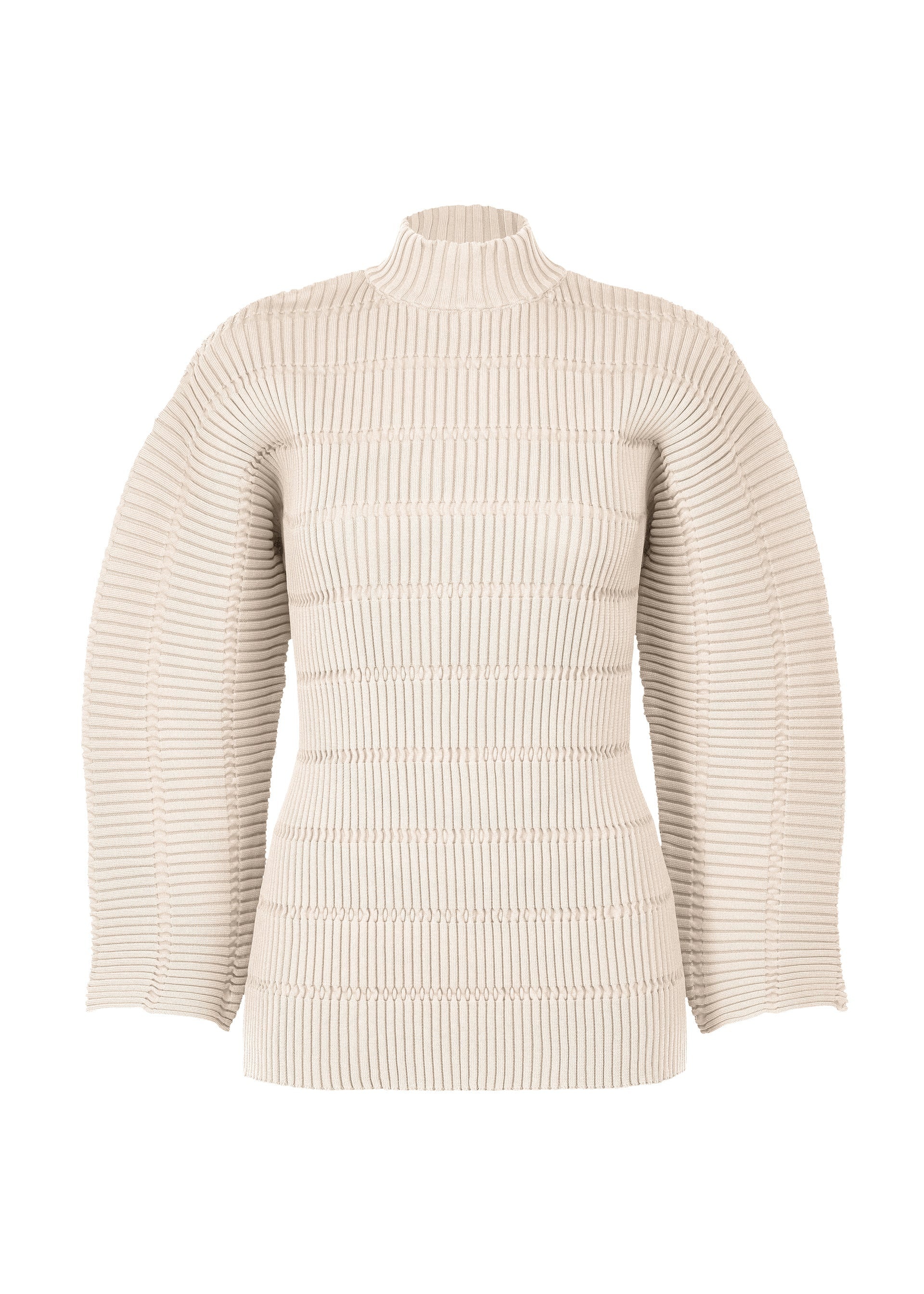 This high-neck knit expresses regular pleats with its knitting structure. It is made with recycled polyester in pursuit of fluffy softness. It is characterized by the folded look of the front that flutters when worn.