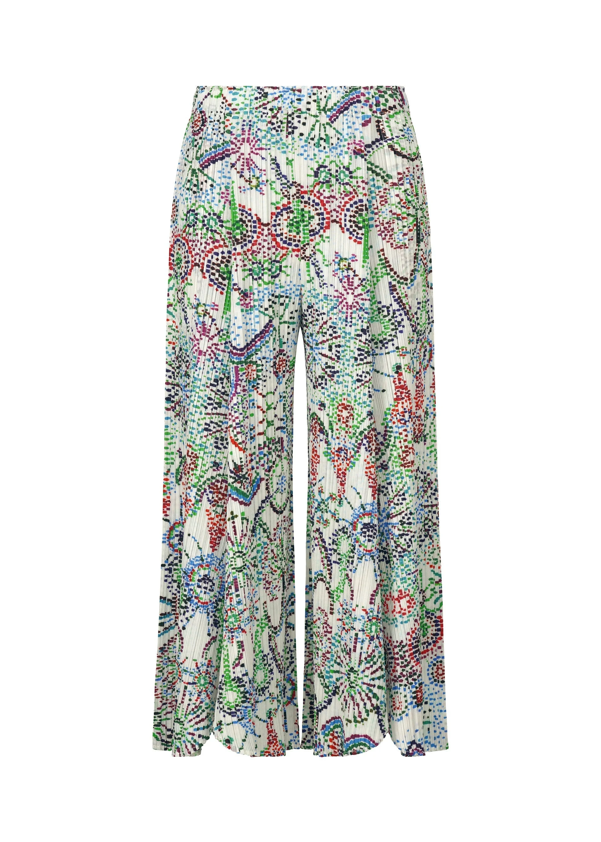These flared pants have a print featuring the motif of fireworks that evoke a sense of innocence and warmth. They depict fireworks with dots that look like blurred ink. They have pockets on both sides. Product Information Material: 100% polyester Made in Japan Waist Specifications:Rubber Pocket (position):Both sides