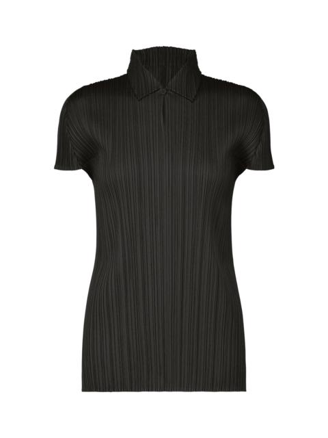 This collared, short-sleeved top is available in light colors that make you want to dance with every step. With its simple silhouette, it allows you to enjoy colorful layered outfits. It has a buttoned collar and slits on both sides. Product Information Material: 100% polyester Made in Japan Neckline / Collar:Regular Color Front opening:Half button Slit (position):Both sides