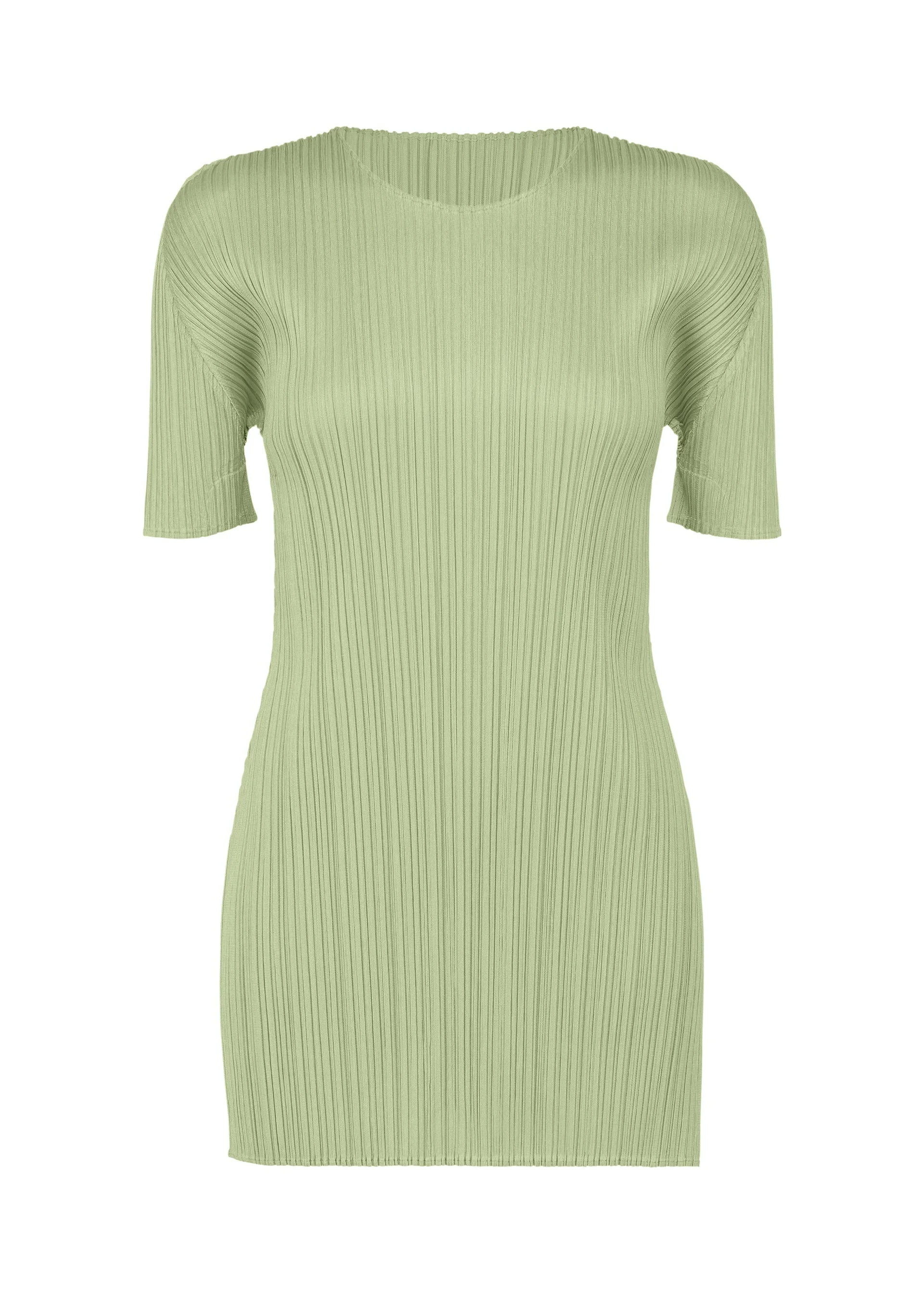 This round-neck, short-sleeved tunic is available in colors reminiscent of the gentle light of early summer. The green gradation is expressed in soft, subdued hues. There is a slit on the left side. Product Information Material: 100% polyester Made in Japan Neckline / Collar:Crew neck Slit (position):left
