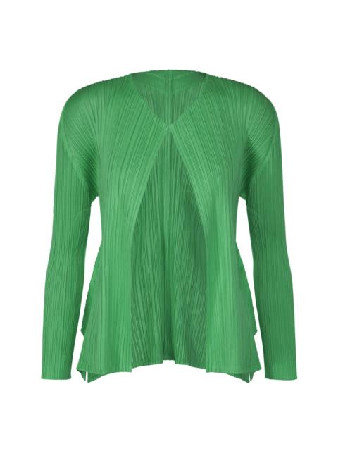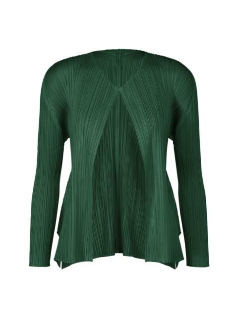 This cardigan is from a MONTHLY COLORS series inspired by spring mountain scenery. The silhouette that flares toward the hems expresses the gentle lines of mountains seen from a distance. The soft, spring-like colors express the richness of life visible as you approach the mountains, such as nuts, berries, leaves, and flowers. There are slits on both sides. Product Information Material: 100% Polyester Made In Japan Neckline / collar:No collar Slit (position):Both sides