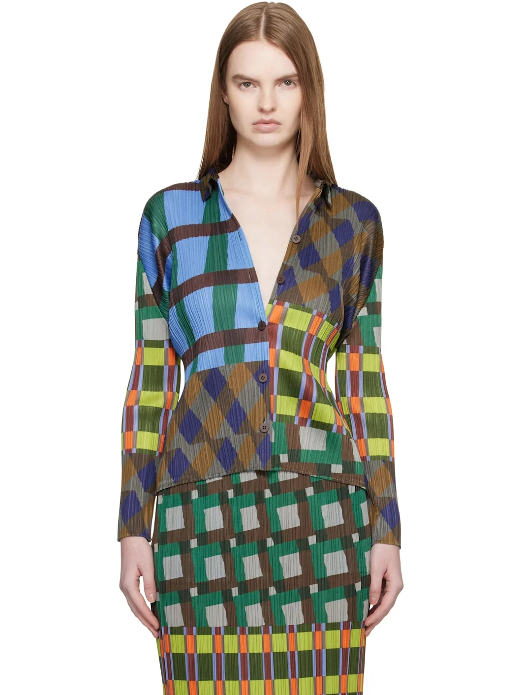 Garment-pleated tricot blouse. · Graphic patterns printed throughout · Spread collar · Button closure Supplier color: Blue 100% polyester. Made in Japan 261941F107000
