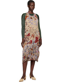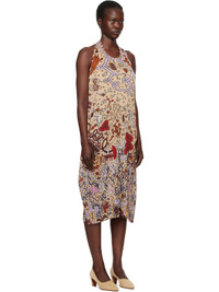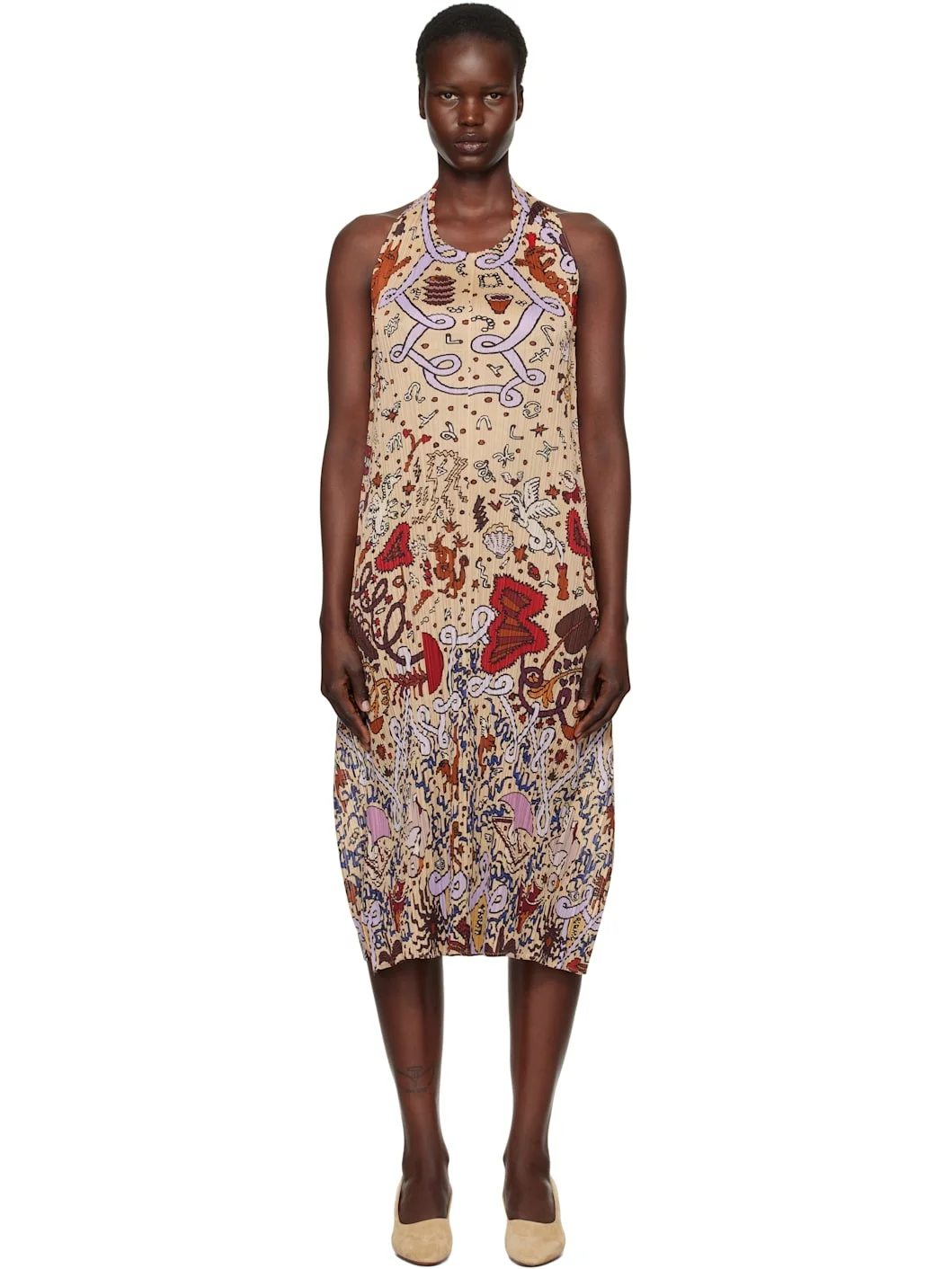 Garment-pleated polyester midi dress. Graphic pattern printed throughout. · Scoop neck · Slit at side seams · Fixed halter strap · Open back Supplier color: Greige 100% polyester. Made in Japan 251941F054008