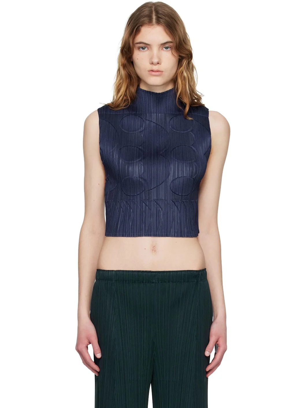 Garment-pleated tricot top. · Graphic pattern embossed throughout · Mock neck · Cropped hem · Dropped armscyes Supplier color: Navy 100% polyester. Made in Japan 261941F099003