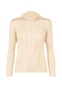 This zippered jacket with a hood is available in warm, subdued colors. It has pockets on both sides.