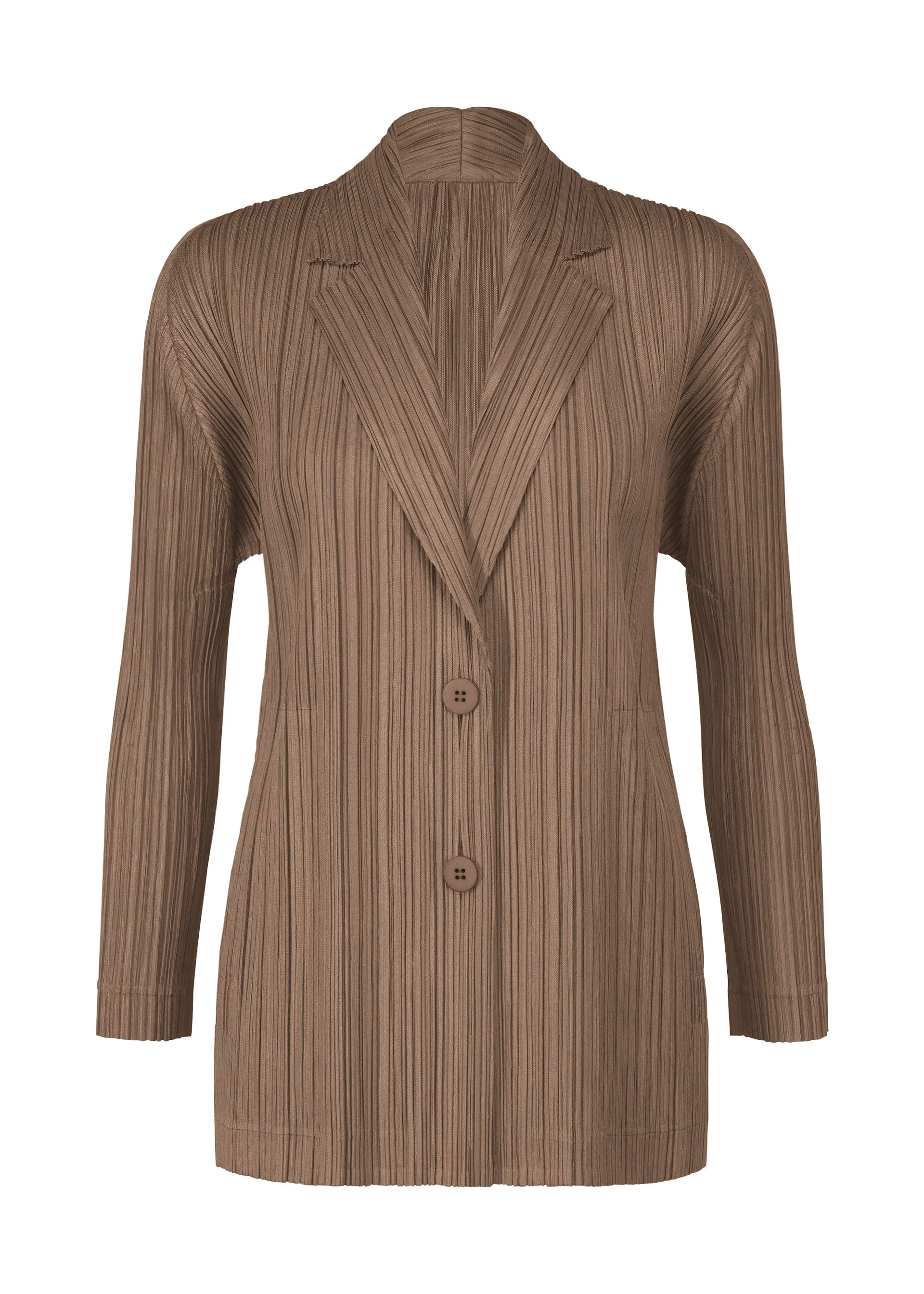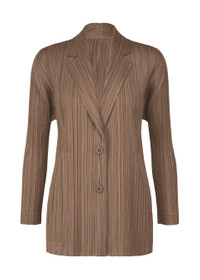 This buttoned, collared jacket is made from thick pleated material. It has pockets on both sides. Product Information Material: 100% polyester Made in Japan Neckline / Collar:Tailored collar Front opening:button Pocket (position):Both sides