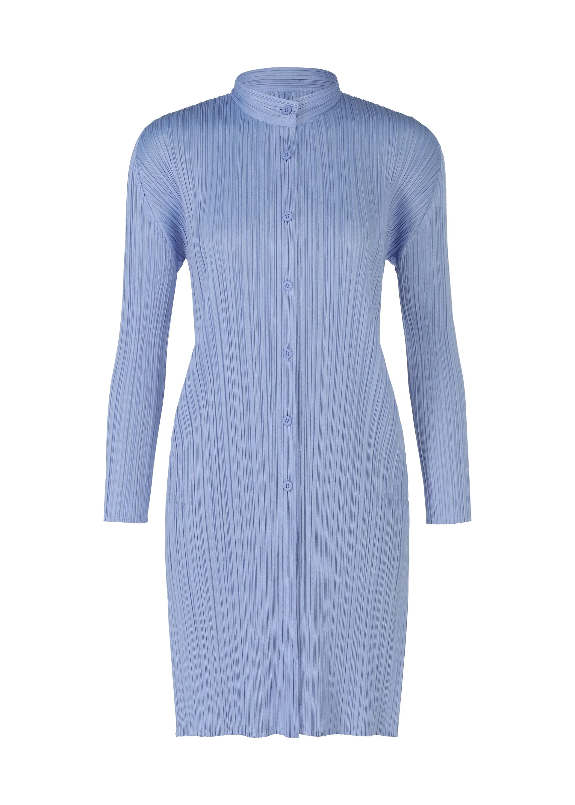 This long-sleeved shirt with a standing collar is available in subdued color tunes. It has a buttoned design with slits on both sides. Product Information Material: 100% polyester Made in Japan Neckline / Collar:Stand collar Front opening:button Slit (position):Both sides