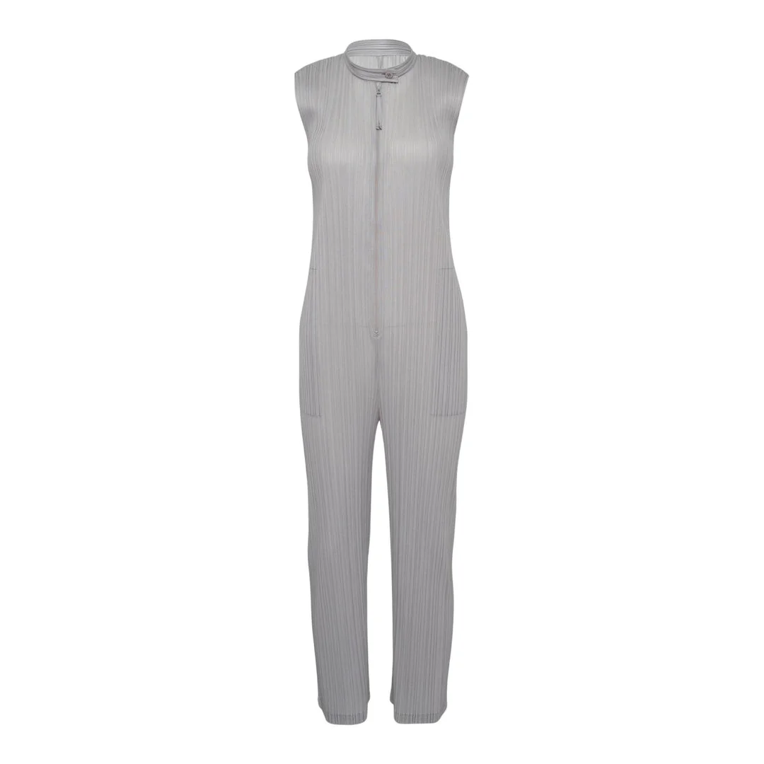 600072480LGY002 / PP58JI136/00/10/SEP - Signature PLEATS PLEASE permanent pleating technology - High mock neckline - Sleeveless design - Front zip closure - Tapered leg silhouette - Wrinkle-resistant polyester construction - Machine washable - Relaxed fit through body PLEATS PLEASE ISSEY MIYAKE September Jumpsuit delivers innovative Japanese design with the brand's signature pleating technology. Crafted from the brand's proprietary polyester pleat fabric in sophisticated light gray, featuring a sleeveless silhouette with high neckline and streamlined fit. The permanent pleating construction ensures wrinkle-free wear and effortless movement while maintaining structural elegance.