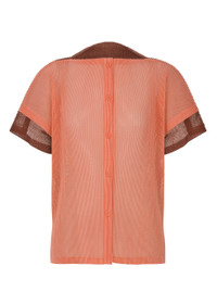 This short-sleeved cardigan utilizes the layering of mesh fabric to express the way X-rays pass through items. The creative use of different fabric colors and sizes adds variation to the simple quadrilateral design. It is buttoned style and has slits on both sides. Product Information Material: 100% polyester Country of origin: Japan neckline/collar:boat neck Front opening:button Slit (position):both sides
