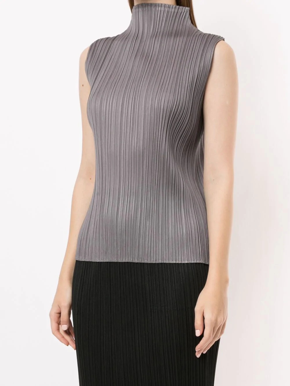sleeveless pleated top Highlights - Smokey grey - Fully pleated - High neck - Sleeveless - Straight hem Imported Composition Polyester 100% SIZE & FIT Model measurements Height 5 ft 9 in(1.76 m) Bust/Chest 31.88 in(81 cm) Hips 37 in(94 cm) Waist 25.19 in(64 cm) FittingInformation This piece fits true to size. We recommend you get your regular size Cut for a loose fit Made with a mid-weight stretch fabric