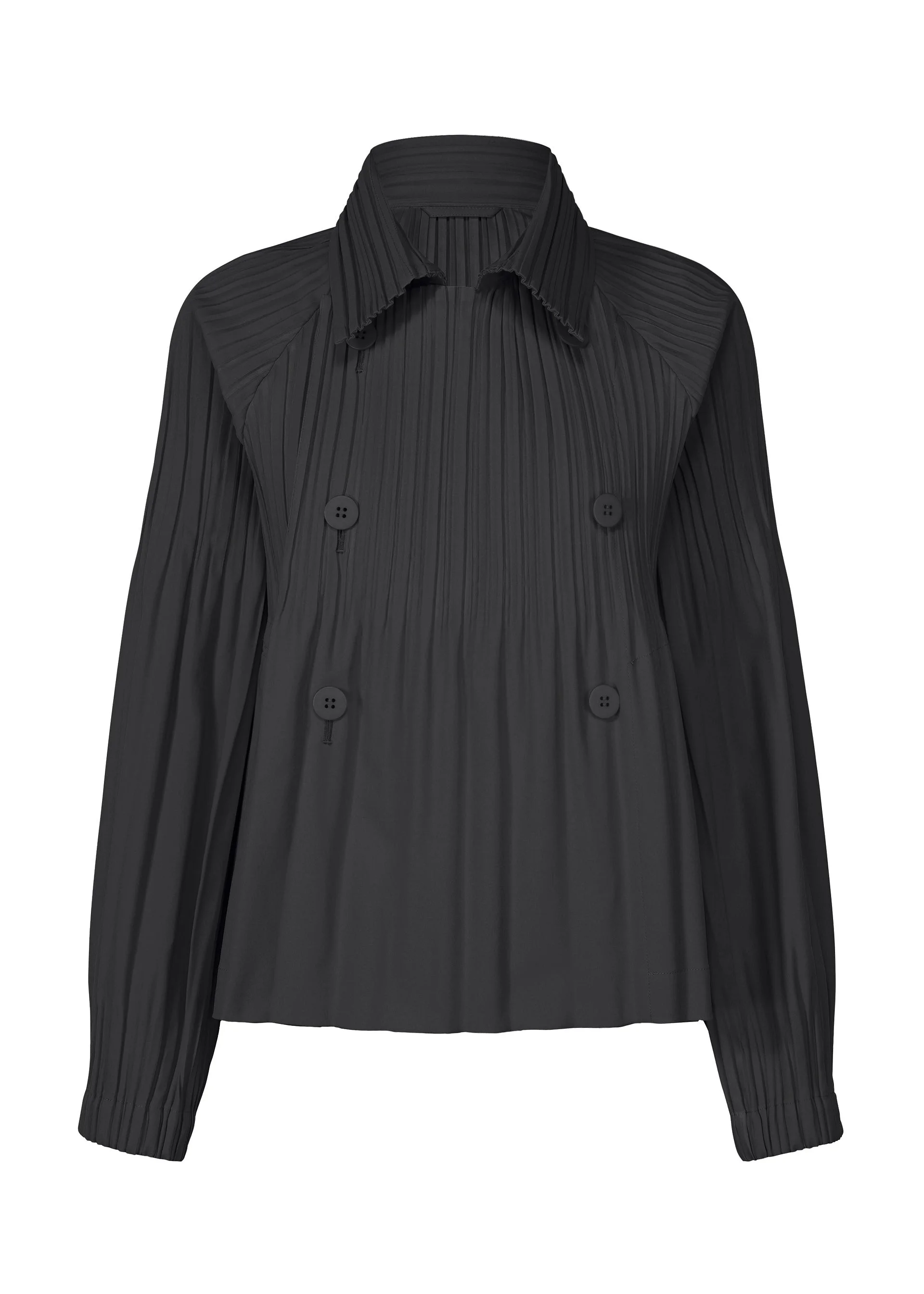 This double-breasted short coat is made from thick, wind-resistant fabric that is ideal for chilly seasons. It has pockets on both sides. It is characterized by its sleeves with Keshi pleats. Product Information Material: 100% Polyester Made In Japan Neckline / collar:Stand collar Front opening:Double button Pocket (position):Both sides Others:Collar hanger
