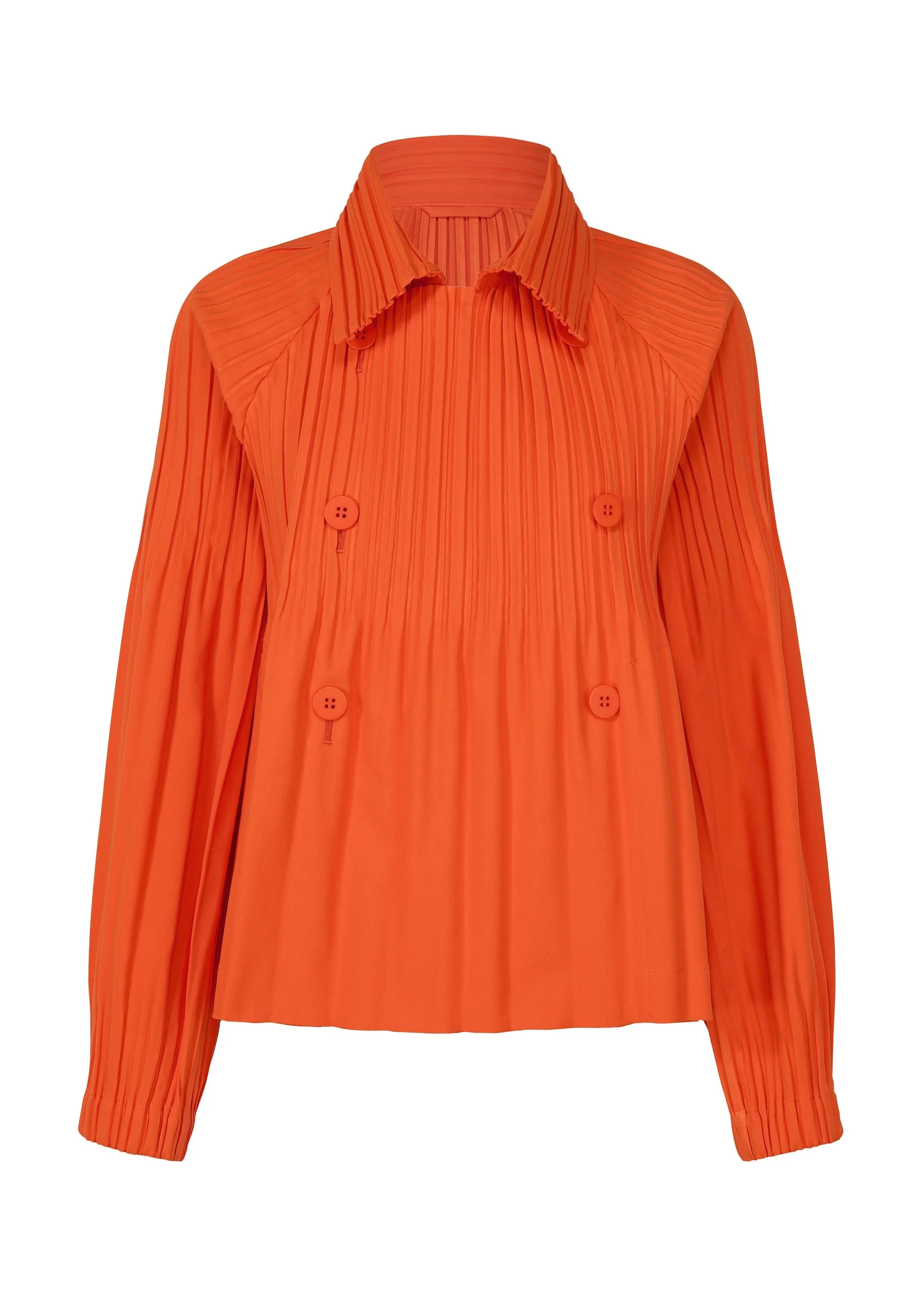 This double-breasted short coat is made from thick, wind-resistant fabric that is ideal for chilly seasons. It has pockets on both sides. It is characterized by its sleeves with Keshi pleats. Product Information Material: 100% Polyester Made In Japan Neckline / collar:Stand collar Front opening:Double button Pocket (position):Both sides Others:Collar hanger