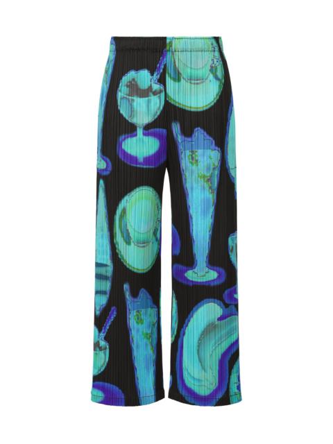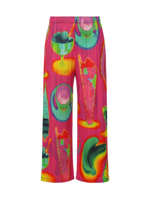 These medium-weight pants have a print featuring the temperature differences of various items captured with an infrared thermographic camera, including soft serve ice cream, bananas, and hot coffee. They are available in two color options: Pink which looks as if the motifs are heated, and Black which looks as if they are cooled. They have pockets on both sides. Product Information Material: 100% polyester Country of origin: Japan Waist specifications:rubber Pocket (position):both sides