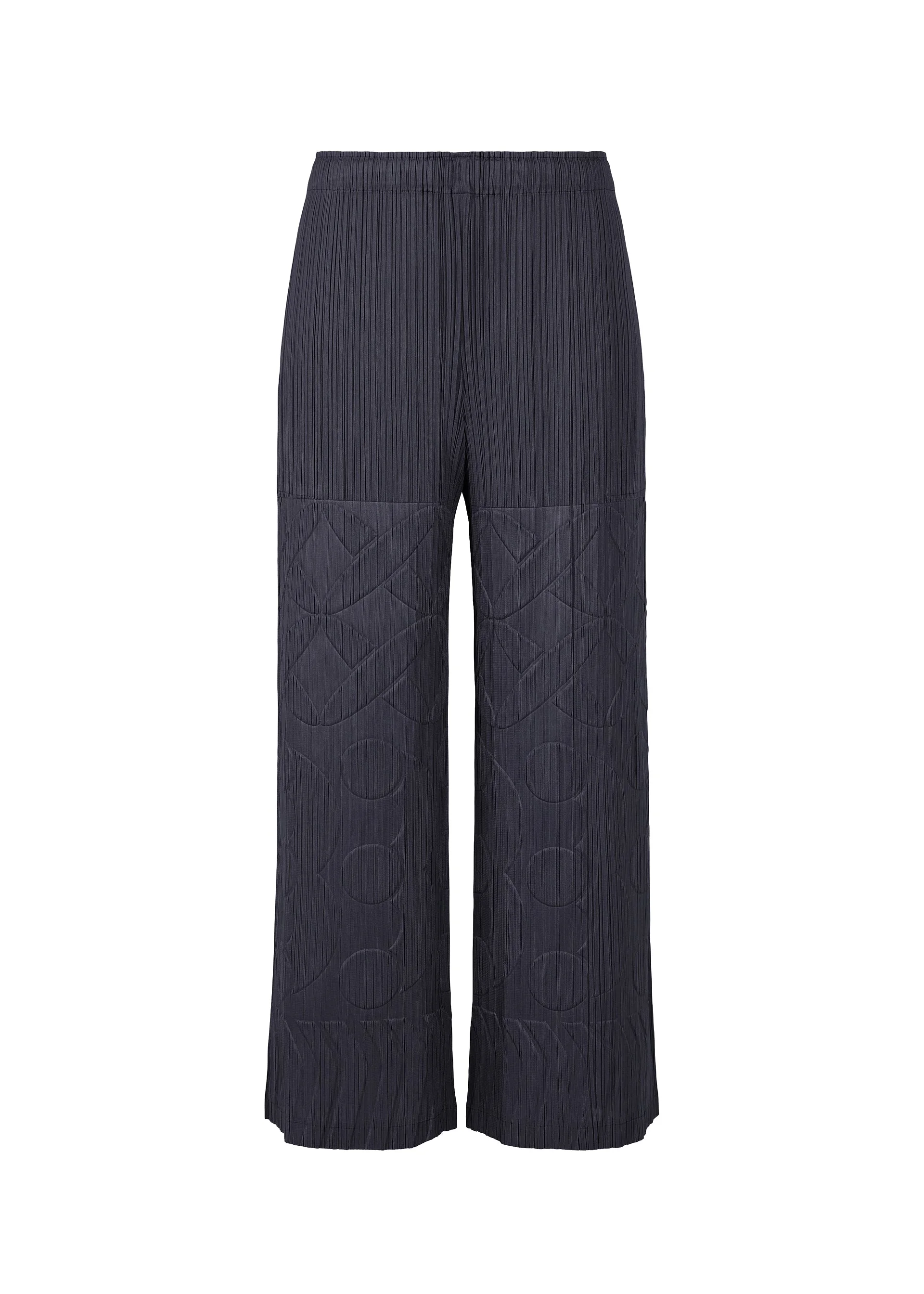 These mid-weight pants are from a series that uses embossing to express a list of various combinations of body movements, such as joining the hands, folding the arms, and crossing the legs. They have pockets on both sides. Product Information Material: 100% polyester Made in Japan Waist specifications:rubber Pocket (position):Both sides