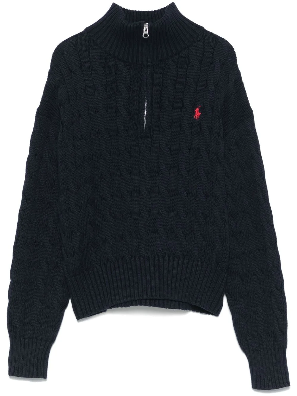 cable-knit cotton sweater Highlights - Navy blue - Short front zip fastening - Ribbed cuffs and hem - Signature polo pony motif - High neck Imported Composition Cotton 100% Washing instructions Machine Wash