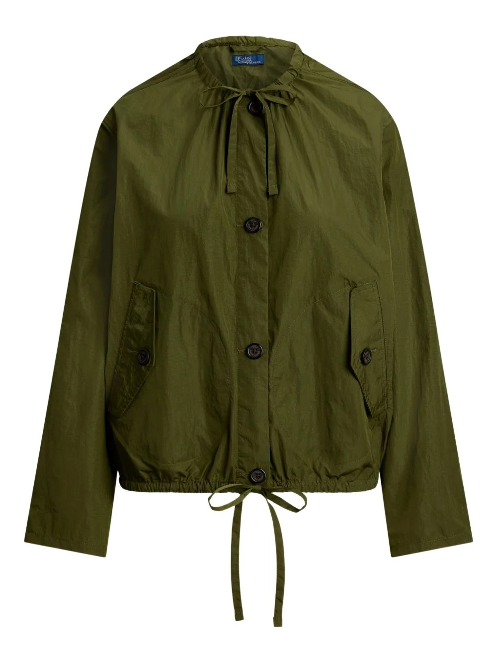 drawstring-hem jacket Highlights - Olive green - Button fastening - Drawstring - Front pockets - Collarless - Woven Imported Composition Recycled Nylon 100% Washing instructions Read Manufacturer Guidelines