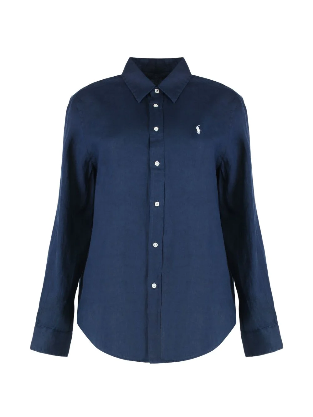 long-sleeve linen shirt Highlights - Navy blue - Long sleeves - Button fastening - Round hem - Logo detail - Buttoned cuffs Imported Composition Linen/Flax 100% Washing instructions Read Manufacturer Guidelines